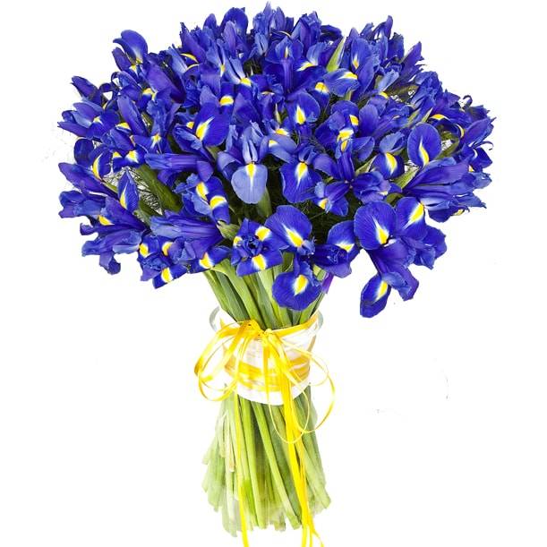 75 синих ирисов, лента. Высота 60 см, Диаметр 45-50 см