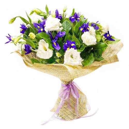 Нежный букет в бело-фиолетовой цветовой гамме восхищает одним своим видом! Белоснежные лизиантусы, невероятно красивые ирисы и яркие листья салала непременно доставят удовольствие получателю по случаю дня рождения, 8-Марта, праздника всех влюбленных, годовщины, юбилея и т.д. Актуален такой подарок и в самый обыденный день, принося вместе с собой целое море позитивных эмоций, а также напоминая о счастливых минутах жизни.